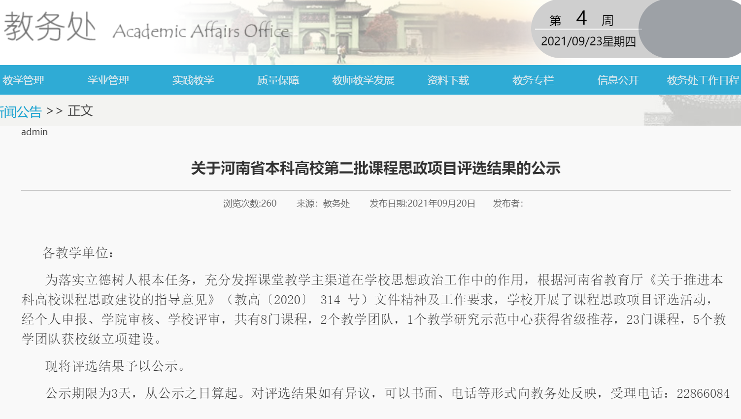 9月20日,565net必赢官方网教务处公示了河南省本科高校第二批课程思政项目评选结果。经个人申报、学院审核、学校评审,全校共有8门课程,2个教学团队,1个教学研究示范中心获得省级推荐,23门课程,5个教学团队获校级立项建设。